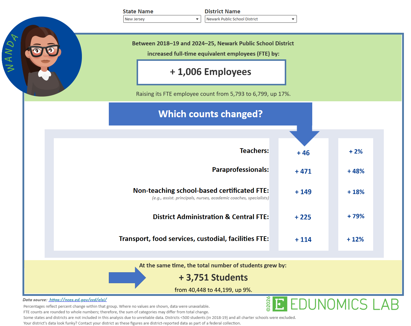 With a tool called WANDA developed by Georgetown University’s Edunomics Lab, you can look up your own school district and see the number of employees added between 2018-2025 juxtaposed with changes in student enrollment. Staff are divided into teachers, paraprofessionals, non-teaching certified staff, administrators, and transport/food services.