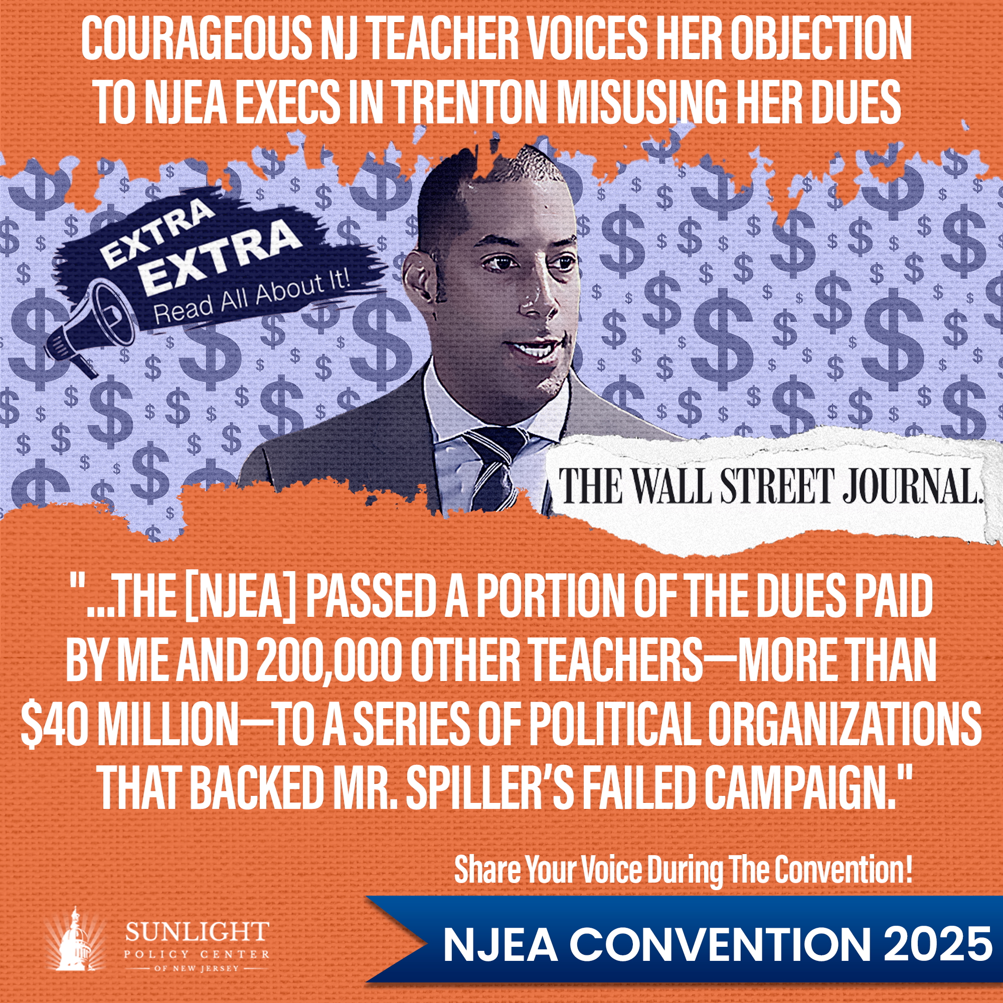 “Sunlight Policy Center of New Jersey is focused on one thing – providing the facts to New Jersey teachers so they can make the best decision for themselves and their families,” said Michael Lilley, Sunlight’s president. “We already knew NJEA leadership used dues to make themselves millionaires, but now there’s the $45 million of dues wasted on Spiller’s run. All of this has been hidden from the very teachers whose dues funded it. We see many comments from unhappy teachers on Sunlight’s social media feeds, but none have gone public with their anger for fear of retaliation.”