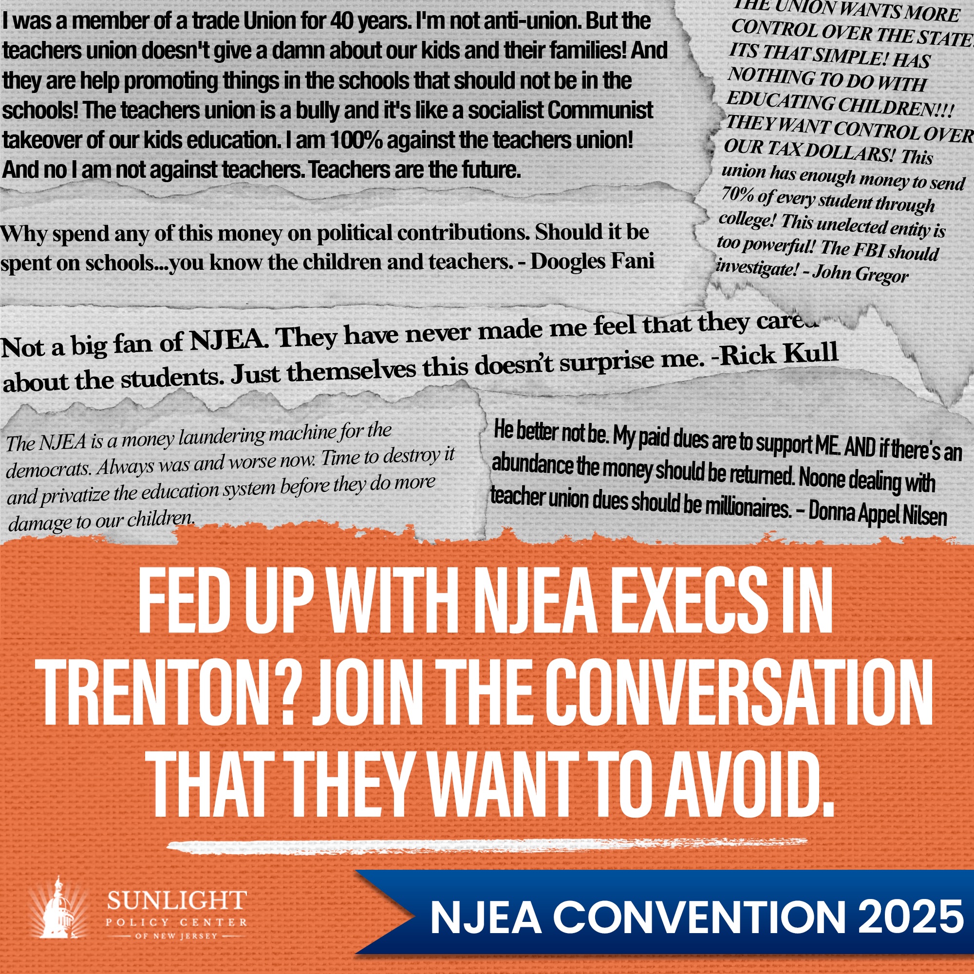 Here is what will be different on November 6-7: Sunlight is running a multi-pronged campaign focusing on a teacher petition with over 2,000 signatures demanding answers on why NJEA executives felt comfortable unilaterally spending $45 million of teacher annual dues for former NJEA President Sean Spiller’s “weird ego trip” to become New Jersey’s next governor. Over the two days, teachers in attendance in Atlantic City will watch LED billboard trucks circling the Convention Center and nearby hotels, be approached by street teams, and receive material dropped off in their hotel rooms, all in service of demanding transparency and accountability from NJEA executive leadership regarding how it spends their money. All 200,000 NJEA members, regardless of whether they attend the Convention, will receive text messages urging them to insist union executives address their concerns about decisions to spend their money on a losing campaign (Spiller came in a distant fifth) where teachers had no voice. ( Each vote for Spiller cost NJEA union members $533 in dues.)